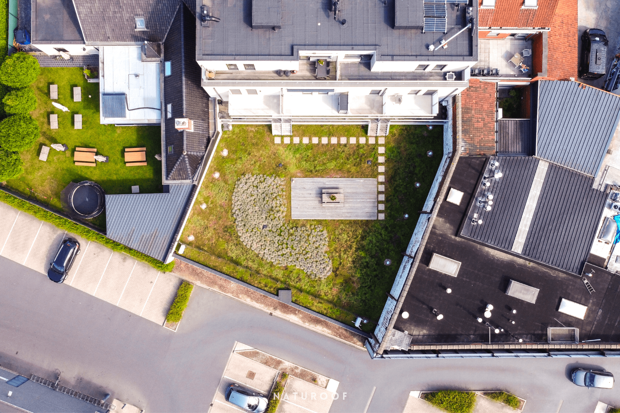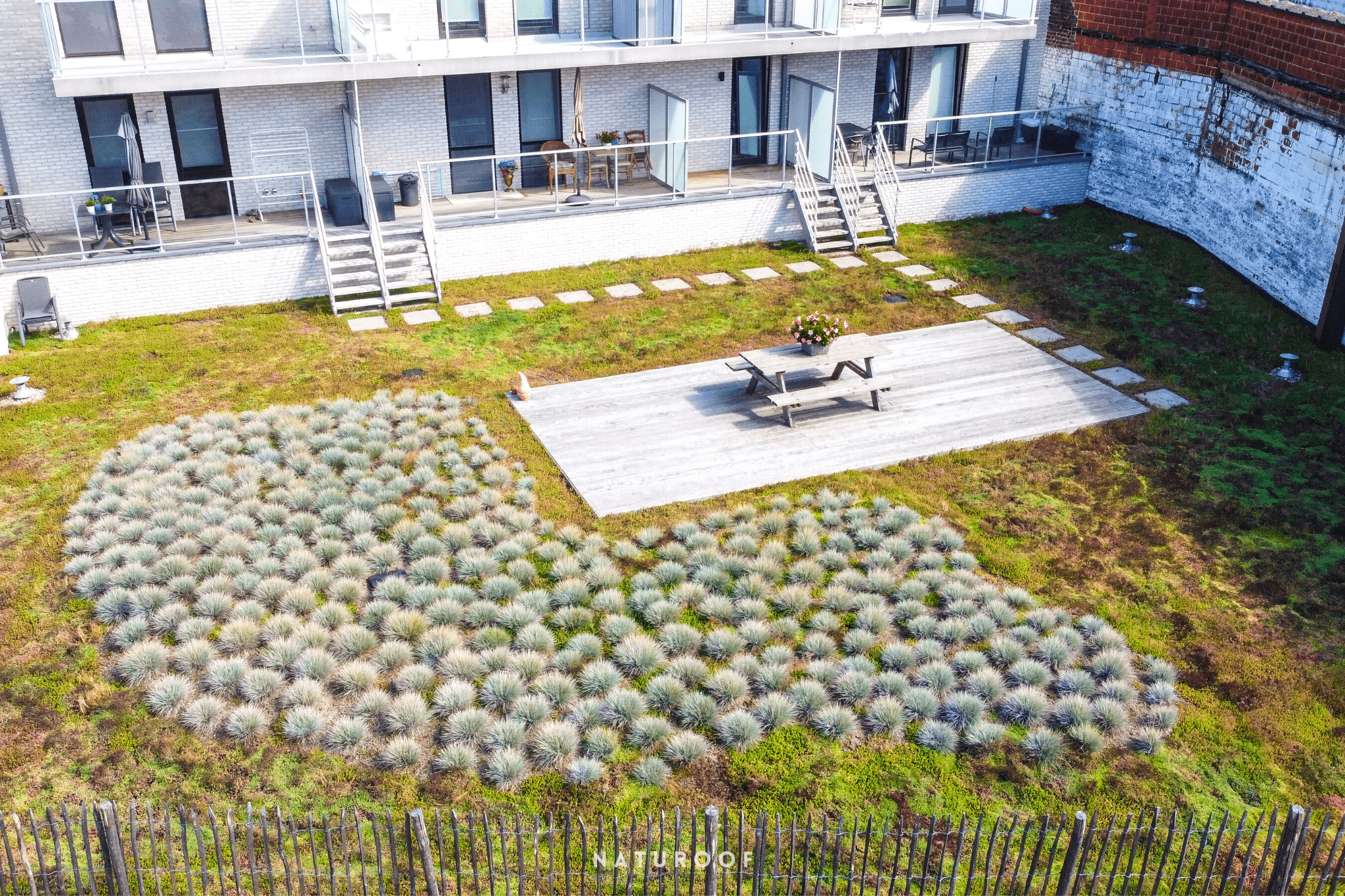 Dit semi-intensief groendak van 350 m² in Ingelmunster werd aangelegd bij een appartementsgebouw. Er werd een hardhouten dakterras voorzien zodat de bewoners optimaal kunnen genieten van de groene omgeving. Het semi-intensief groendak bevat droogteresistente siergrassen en sedumplanten. Dit groendak werd aangelegd voor opdrachtgever Sofimo.